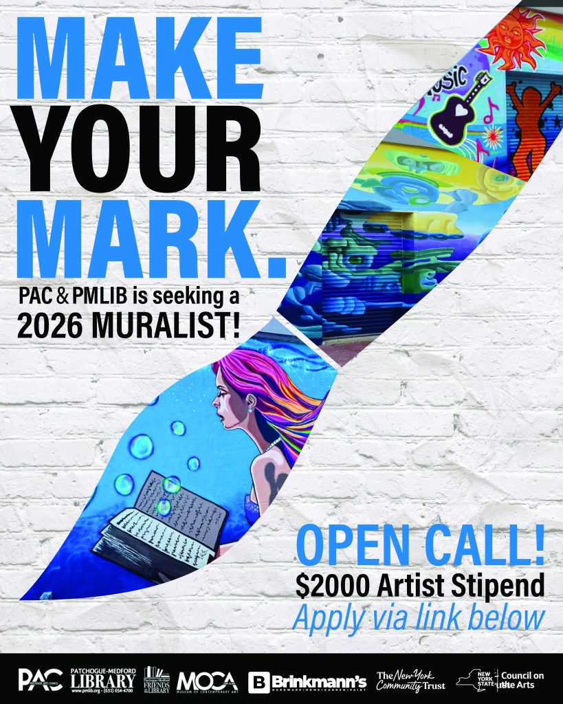 THE WALL | Patchogue Arts Council, in collaboration with the Patchogue- Medford Library, is pleased to announce it is accepting submissions from muralists to exhibit a temporary mural on the rear of the Patchogue-Medford Library. This year there is no specific theme, artists are encouraged to view past murals from this project. The mural wall is aprox 15’h x 45’L